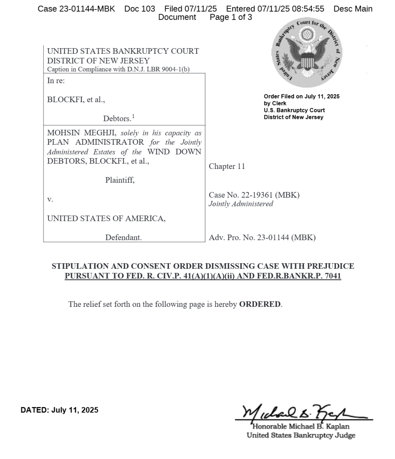 Мохсин Мегджи, администратор плана для замастных поместье Blockfi, представлял криптовалютную фирму в этом случае. Министерство юстиции было представлено старшим судебным адвокатом Сету Б. Шапиро и его командой из отделения коммерческих судебных разбирательств гражданского отделения.
