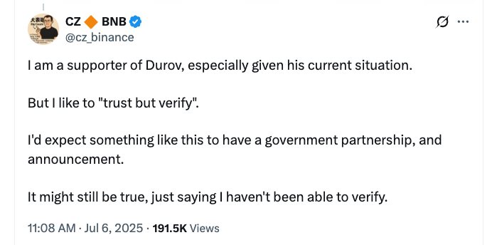 Некоторые выдающиеся деятели в сообществе криптовалют, такие как бывший генеральный директор Binance Changpeng Zhao, быстро подвергли сомнению авторитет объявления Тон.