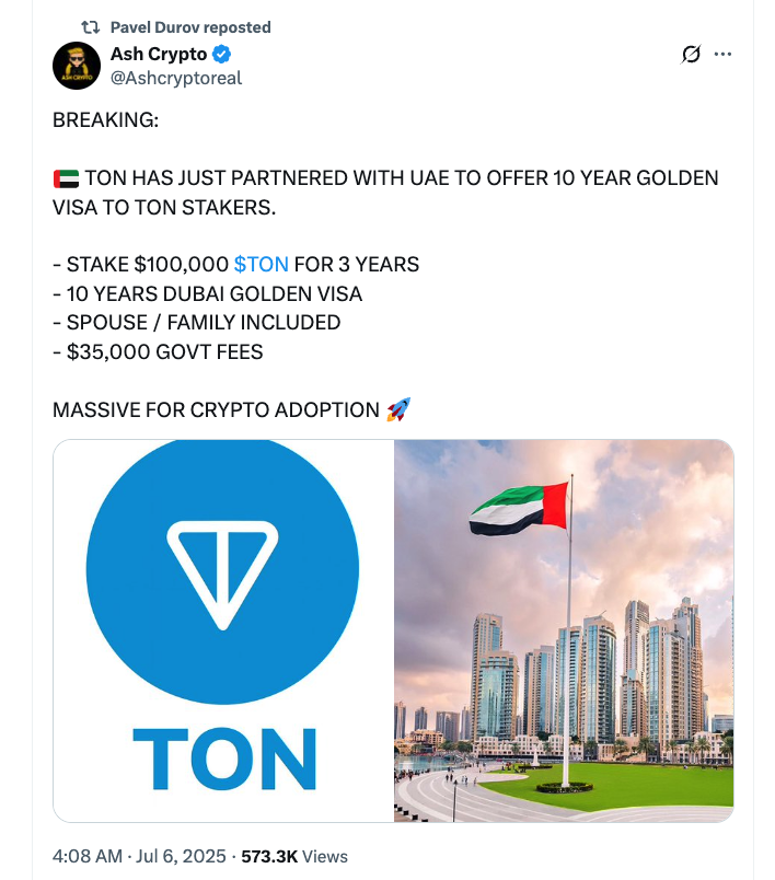 «Тон только что сотрудничал с ОАЭ, чтобы предложить 10-летнюю золотую визу для Ton Stakers»,-сказал теперь подаченный X Post от Ash Crypto, который был ретвитнул Дуров.