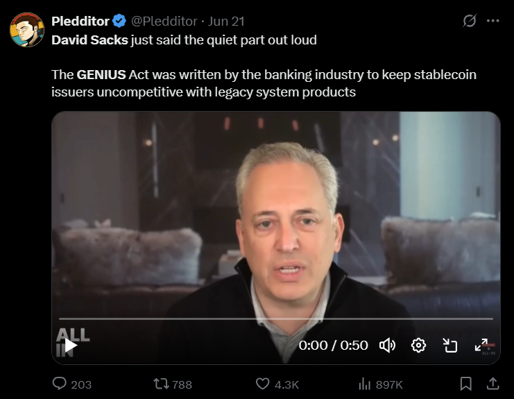 Еще в мае профессор и консультант по блокчейну Нью-Йоркского университета Остин Кэмпбелл процитировал источники в банковской индустрии, показывая, что финансовые учреждения активно лоббируют, чтобы блокировать интересующие стаблеки для защиты своей давней бизнес-модели.
