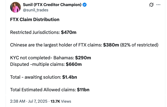 На следующей неделе сообщество кредиторов FTX ожидает постановления, которое может позволить FTX Bankrupty Estate выплаты кредиторам в «ограниченных странах», включая Китай.