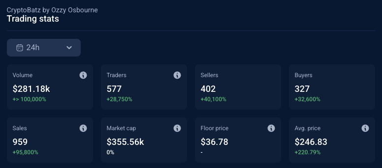 В дополнение к растущей цене на этаже, Cryptobatz Ozzy Osbourne NFT испытали драматический всплеск объемов торговли.