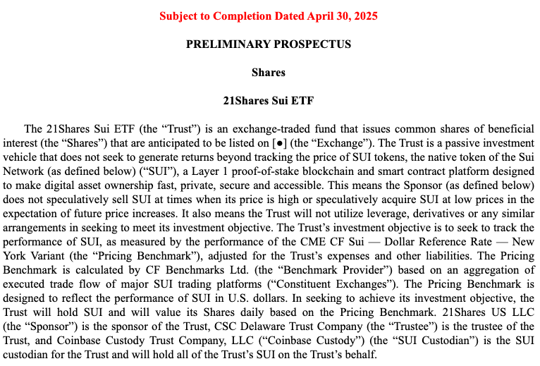 Названный 21Shares SUI ETF, предлагаемый ETF выпустит обыкновенные акции полезных интересов, стремясь отслеживать эффективность SUI, удерживаемой дочерней компанией 21Shares.
