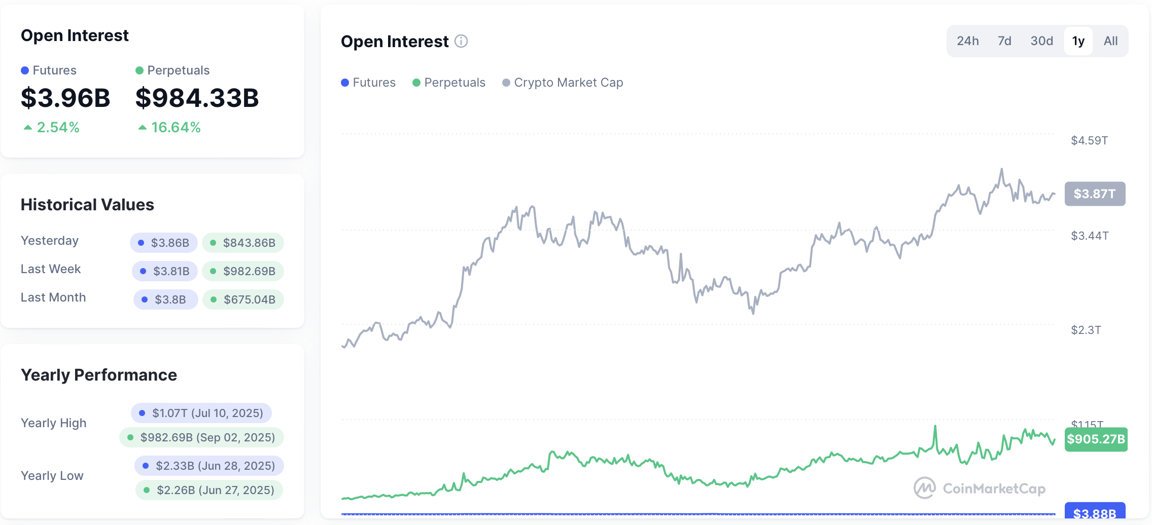 Согласно данным CoinmarketCap, открытая доля в производных криптовалюте, общая стоимость активного фьючерса и вечных контрактов, которые держат трейдеры, в настоящее время составляет около 3,96 млрд. Долл. США.