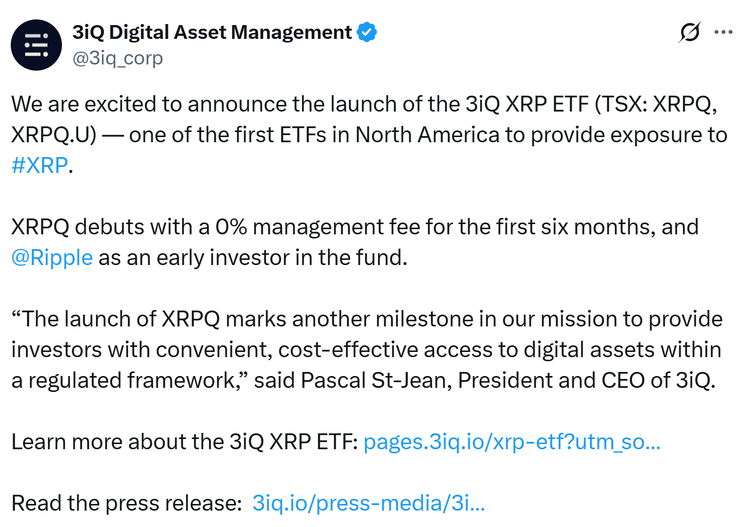 «Запуск XRPQ отмечает еще одну веху в нашей миссии по предоставлению инвесторам удобный, экономичный доступ к цифровым активам в рамках регулируемых рамок»,-сказал Паскаль Сент-Жан, президент и генеральный директор 3IQ.