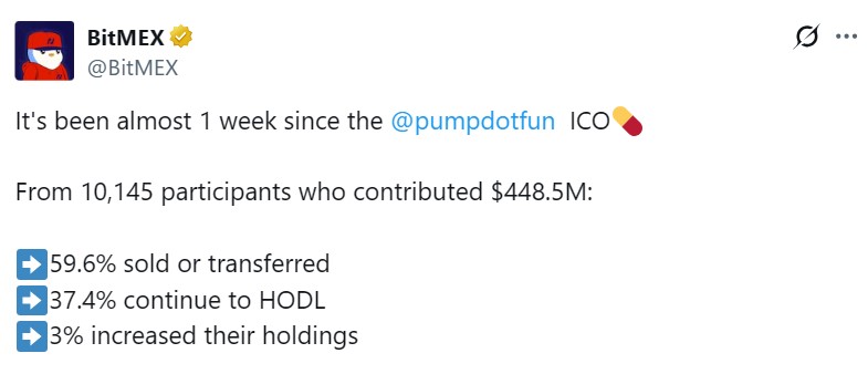 Почти 60% участников Presale в Pump. Начальное предложение монет (ICO) уже продали или перенесли свои токены на централизованные биржи (CEX) или другие кошельки, согласно данным BitMex.