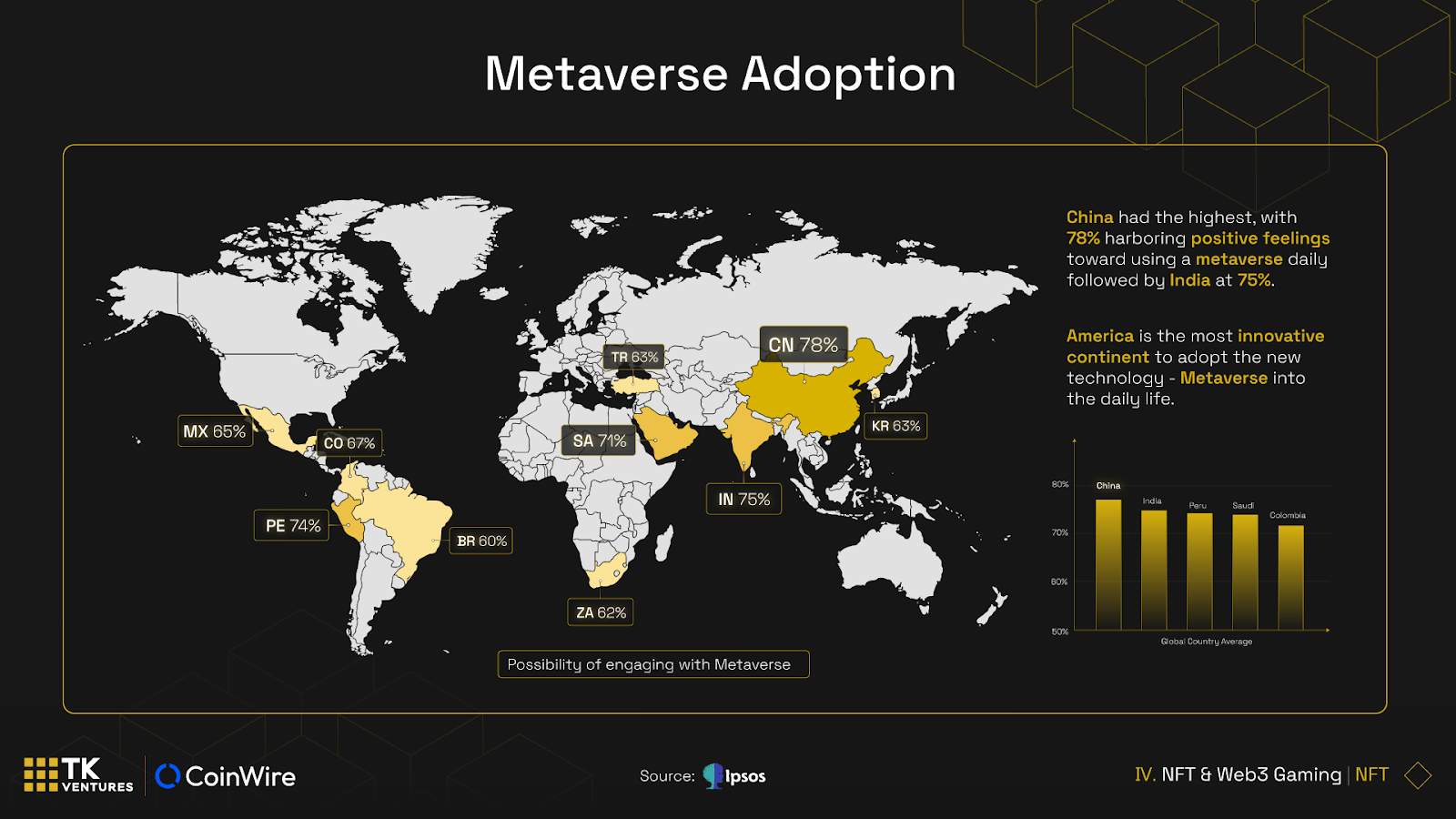 Согласно опросу, США занимают первое место по инновациям метавселенной. Тем не менее, Китай и Индия занимают первые места по положительному отношению к ежедневному использованию метавселенной, 78% и 75% соответственно, как показано выше.