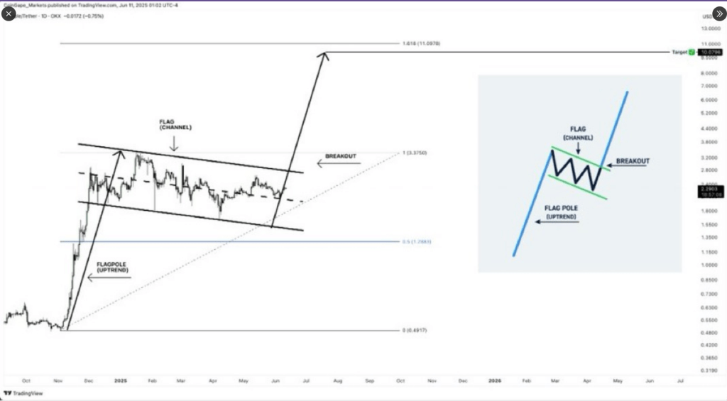 Beast Cryptocurrenty указал на рисунок графика бычьего флага, который начинается с ралли с 0,40 до 3,40 доллара. Образец флага сформировался, когда XRP вернулся в зону $2,00–3,00 долл. США. Он отметил уровень прорыва в 3,37 доллара.
