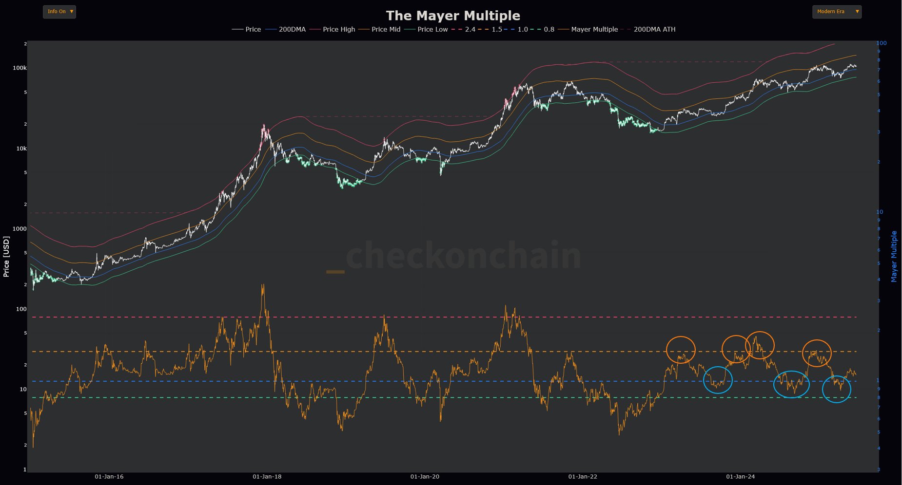 В недавнем сообщении X 21 июня в сети Колледж разделяет положительные долгосрочные перспективы цен на биткоин с использованием Mayer Multy, показатель в цепочке, которая измеряет взаимосвязь между ценой Биткоина и ее 200-дневной скользящей средней (200 дм). Отслеживая ключевые полосы оценки, Mayer Multy помогает определить, переоценивается ли биткоин, недооценен или справедливо, на основе исторического ценового поведения. С тех пор, как бычий рынок начался в 4 квартале 2024 года, Биткоин постоянно перемещался между 1,0X полосой, т. Е. 200dMA (синяя линия) и полосой 1,5x (Orange Line), представляющая зону среднего ценового диапазона.