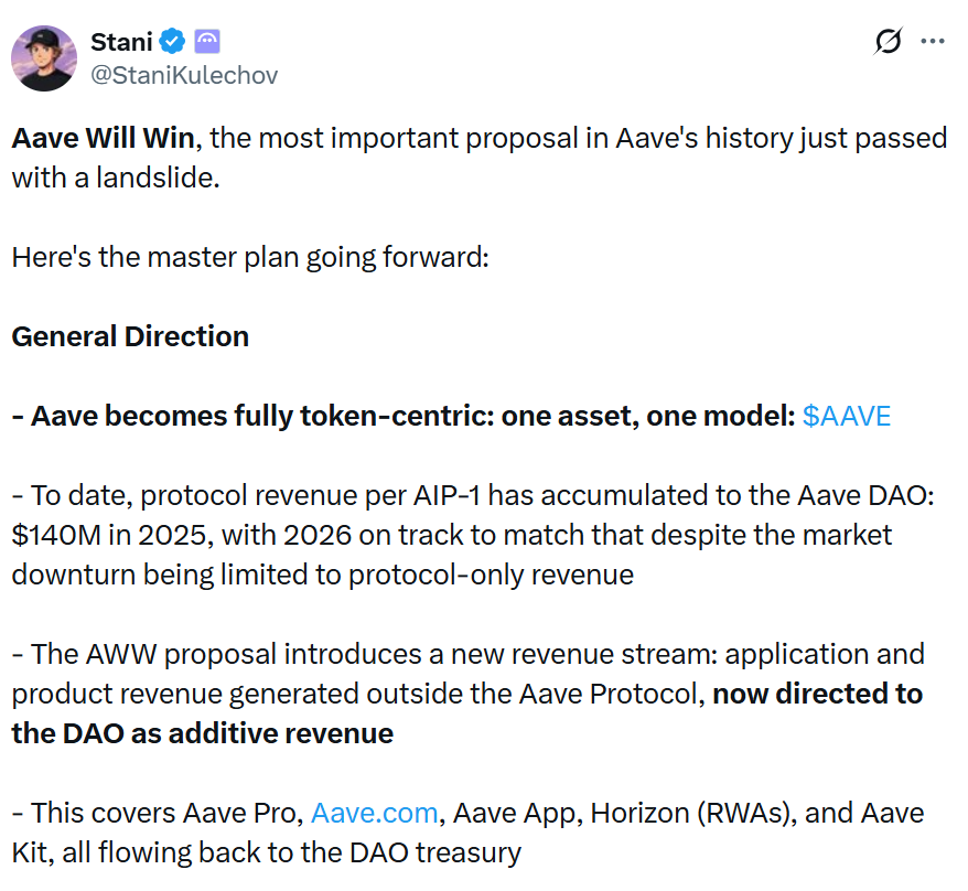 После голосования основатель Aave Стани Кулехов заявил в субботнем посте X, что Aave Win Win — это «самое важное предложение в истории Aave», и оно «только что прошло с большим перевесом».