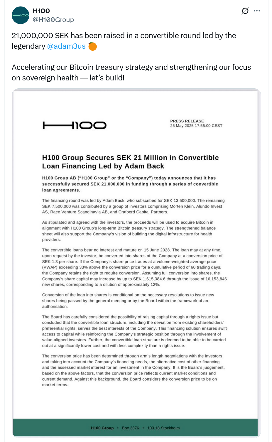 Согласно H100, этот шаг делает его первой публичной компанией в Швеции, которая приняла политику казначейства Биткоин и одну из первых в Европе.