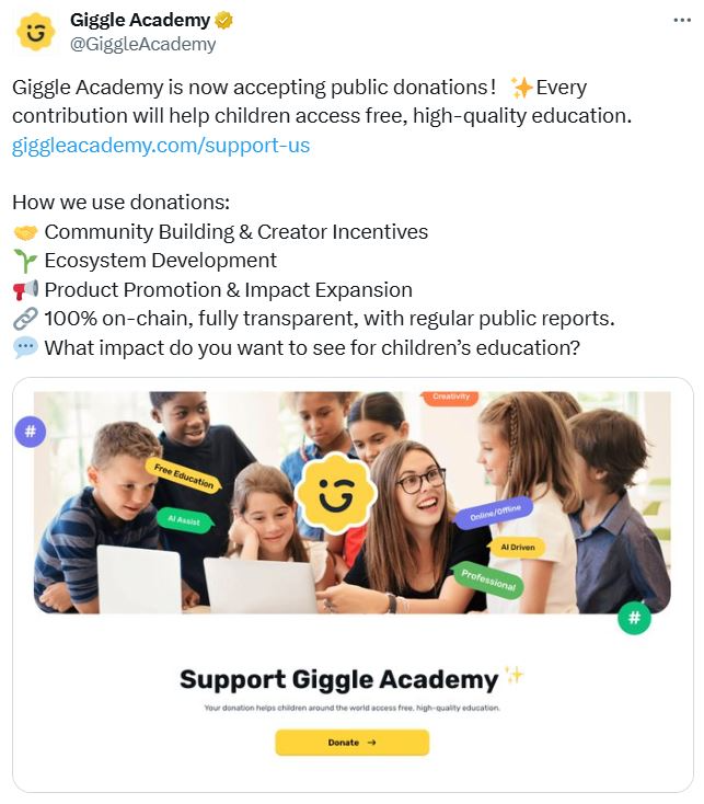Между тем, по словам Dex Screener, количество транзакций Giggle Fund выросло более 470% за последние 24 часа, с объемом 2,8 миллиона долларов, а его описание привязано к «пожертвовательной монете, которая непосредственно пожертвовает на Gigglecademy».