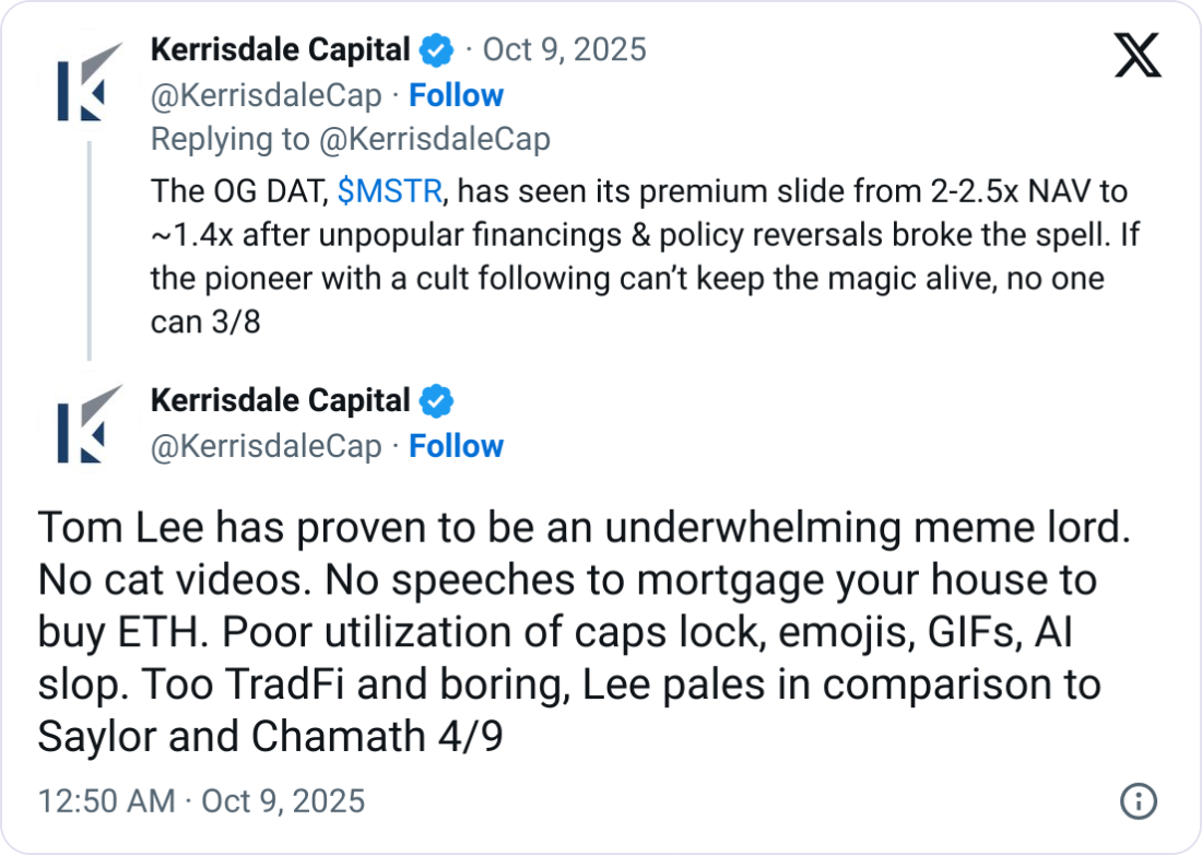Керрисдейл также раскритиковал другие области бизнеса BitMine, заявив, что компания перестала отчитываться о стоимости чистых активов (NAV) на акцию, поскольку ее рост замедлился, а премия за мультипликатор стоимости чистых активов (mNAV) упала с более чем 2,0x в августе до 1,2x к сентябрю.