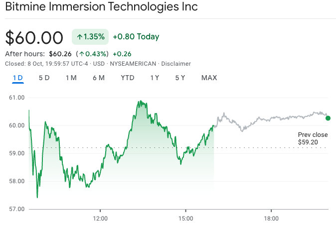 Инвесторы сначала колебались, поскольку акции открылись выше 60 долларов, но упали более чем на 5% в начале торгов до дневного минимума в 57,41 доллара после отчета Керрисдейла. Однако акции BitMine (BMNR) завершили торги во вторник ростом на 1,35% до $60 и продолжили рост на 0,4% после закрытия торгов.