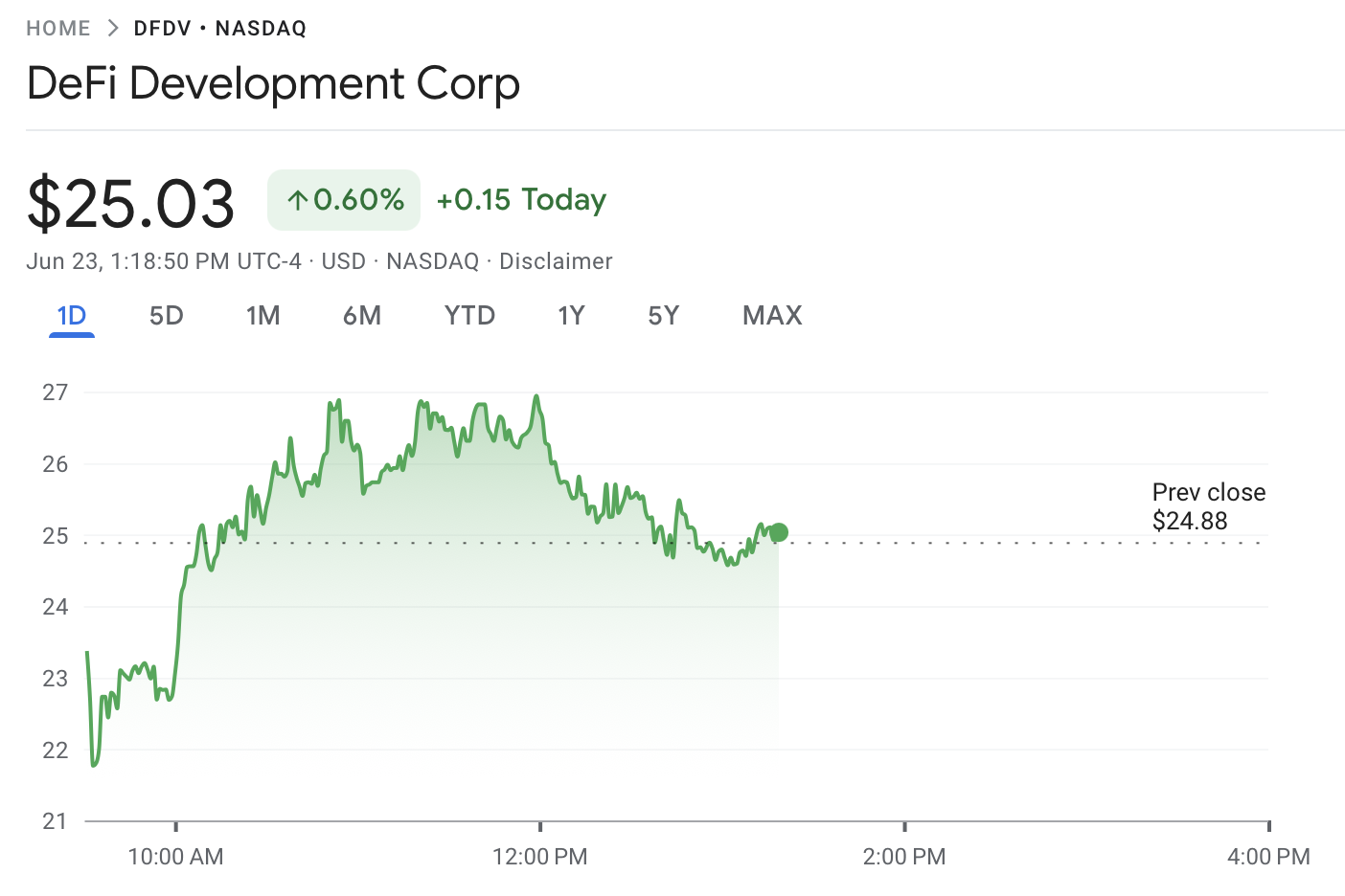 Defi Development Corp акции внутридневной производительности 23 июня. Источник: Google Finance