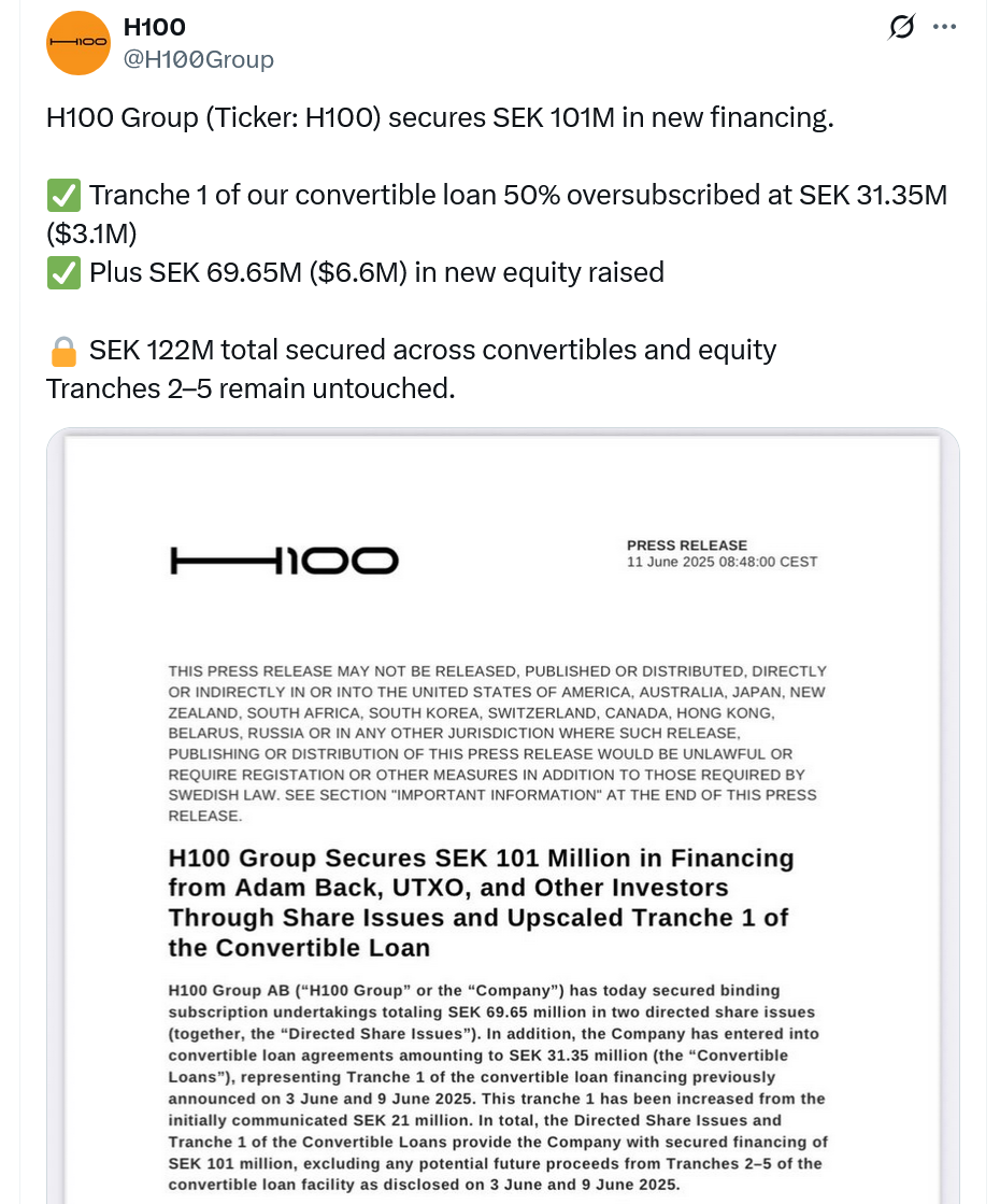 H100 сказал, что чистая выручка от двух «вопросов общего вопроса будет использована для ускорения стратегии казначейства компании».