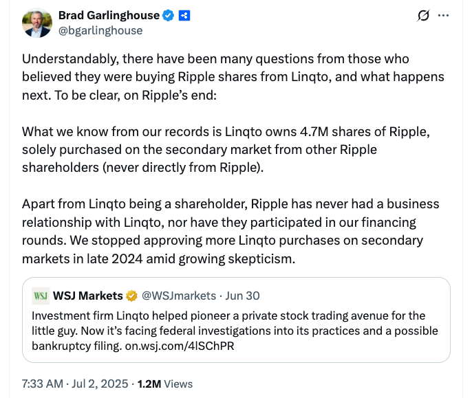 По словам Гарлингхауса, Ripple, как сообщается, прекратила одобрить покупки в Linqto своих вторичных акций в конце 2024 года. Этот шаг произошел примерно в то время, когда регулирующие органы финансовой индустрии (FINRA) завершили обзор брокера-дилера Linqto, Linqto Capital.