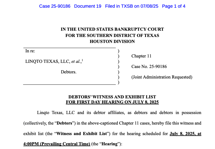 Первое слушание Linqto о банкротстве запланировано на во вторник в 9:00 вечера UTC, причем свидетели, в том числе главного сотрудника по реструктуризации Джеффри Стейн, Кейт Майллу из корпоративной реструктуризации EPIQ, и Райан Гамильтон, старший вице -президент по долговым консультациям и реструктуризации в Jefferies.