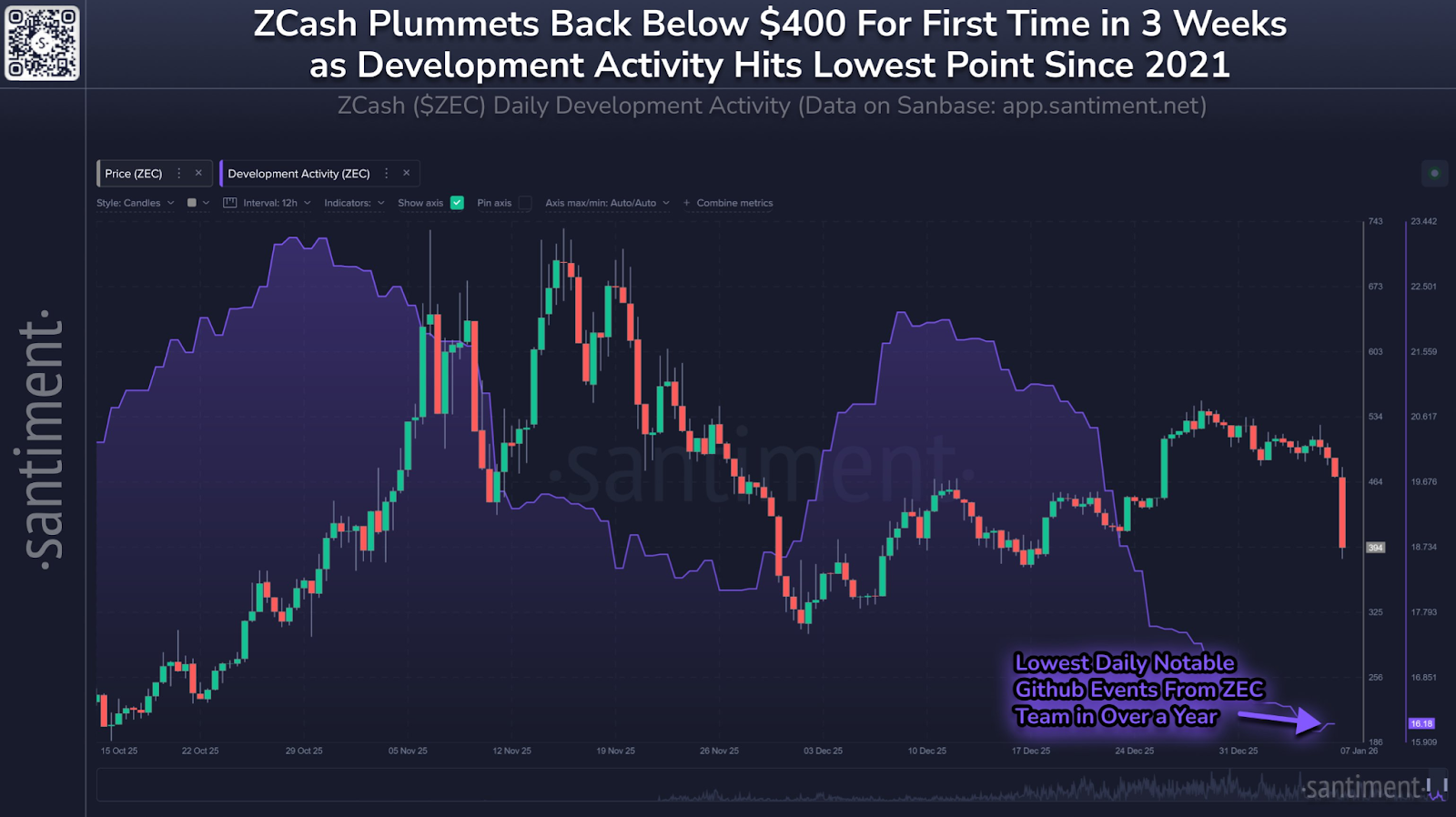 Данные компании по исследованию рынка Santiment, опубликованные в четверг X, показывают, что активность разработчиков, связанных с Zcash, упала до самого низкого уровня с ноября 2021 года. За тот же период токен Zcash (ZEC) упал примерно на 40% за последние два месяца.
