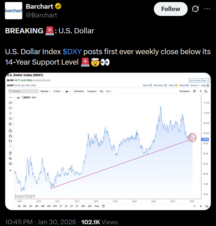 Согласно данным Barchart, индекс доллара США, который отслеживает динамику доллара по отношению к корзине шести основных валют, недавно объявил о недельном закрытии ниже долгосрочного уровня поддержки, который удерживался более десяти лет. Этот шаг может сигнализировать о дальнейшем риске снижения, если прорыв сохранится.