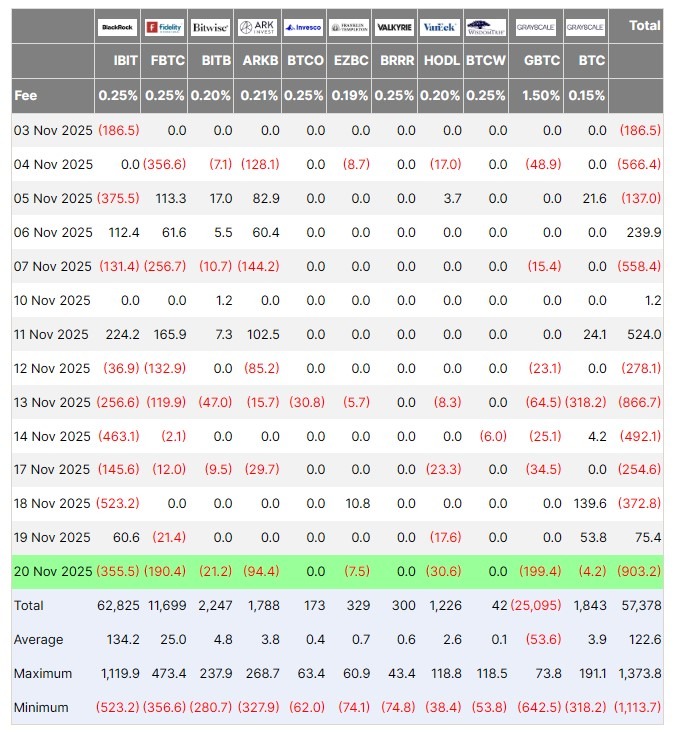 По данным Farside Investors, после перерыва в пятидневной полосе оттока с притоком в $75,4 млн в среду, фонды столкнулись с новыми погашениями в размере $903 млн в четверг — это самый крупный день оттока в ноябре и один из крупнейших однодневных оттоков с момента запуска продуктов в январе 2024 года.