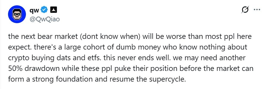 “Существует большая группа глупых денег, которые ничего не знают о криптовалютах, покупающих DAT и ETF. Это никогда не заканчивается хорошо”, – написал он, добавив, что рынкам, возможно, придется пережить еще одну “50%-ную просадку”, прежде чем можно будет сформировать прочный фундамент.