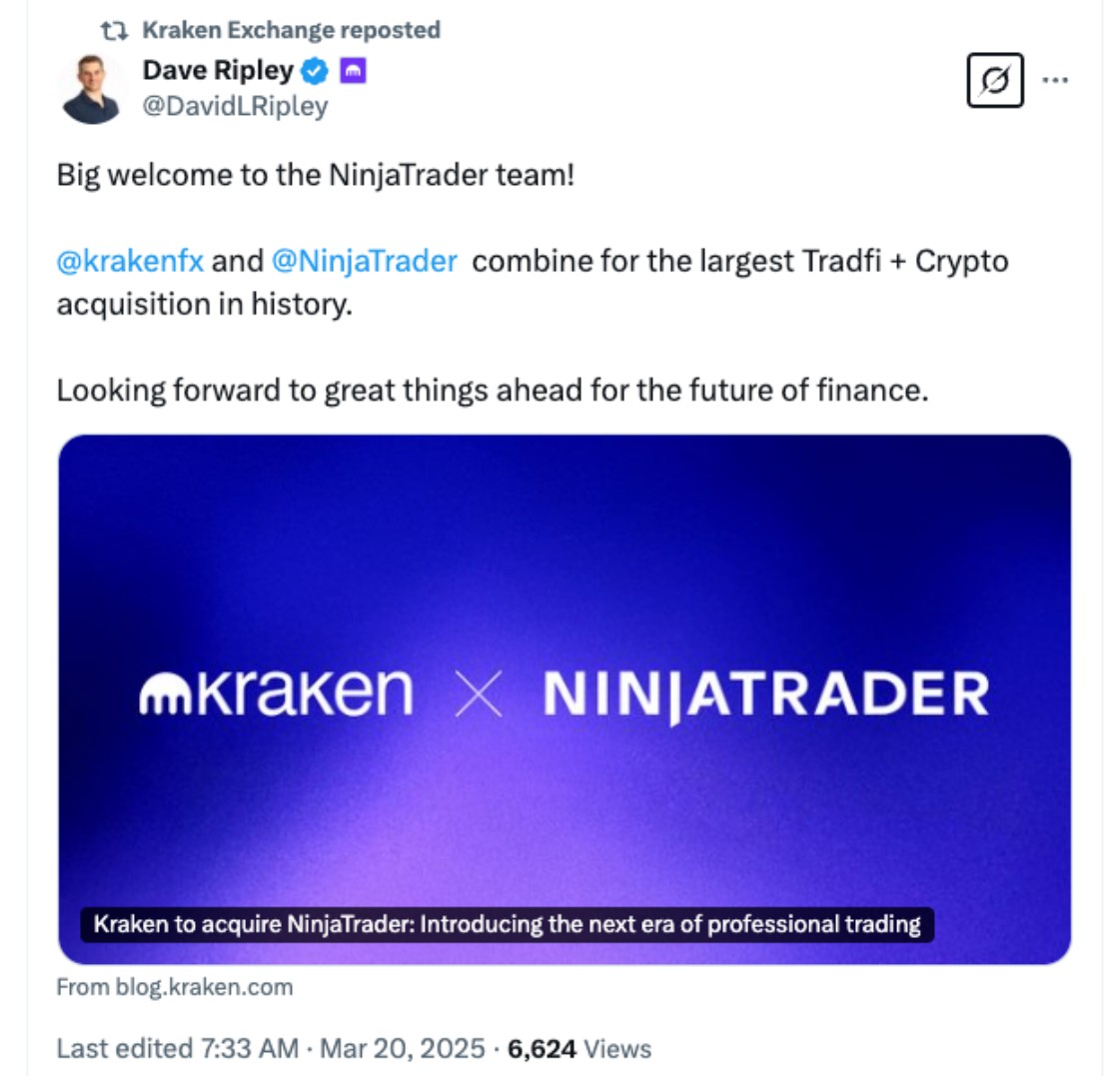 В марте US Cryptocurrents Exchange Kraken согласилась купить Ninjatrader, биржу фьючерсов за 1,5 миллиарда долларов.