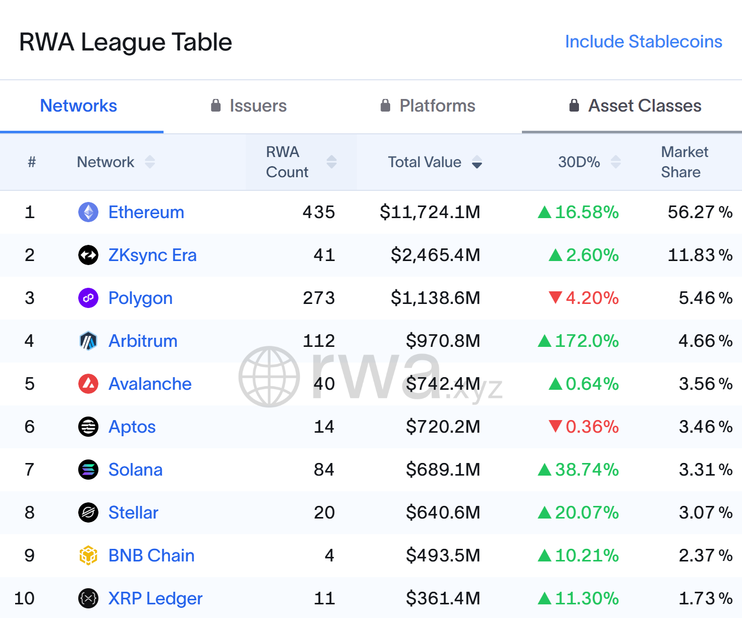 Согласно данным RWA.xyz, Polygon занимает третье место среди всех блокчейн по токенизации реальных активов (RWA) с общей стоимостью более 1,13 миллиарда долларов, распределенной по 273 токенизированным активам. Ethereum остается доминирующим с долей рынка 56%.