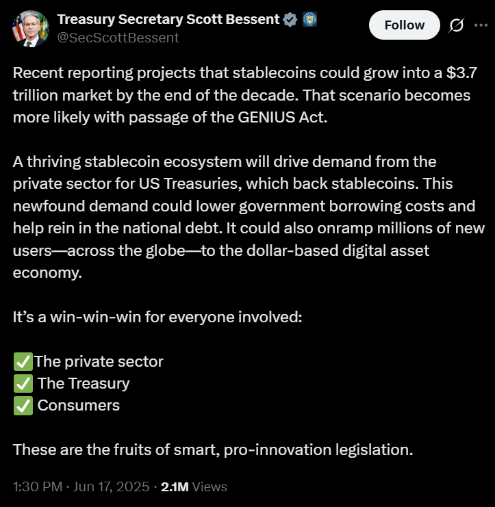Секретарь казначейства Скотт Бессент заявил, что к 2030 году сталетоки могут стать рынком в 3,7 триллиона долларов.
