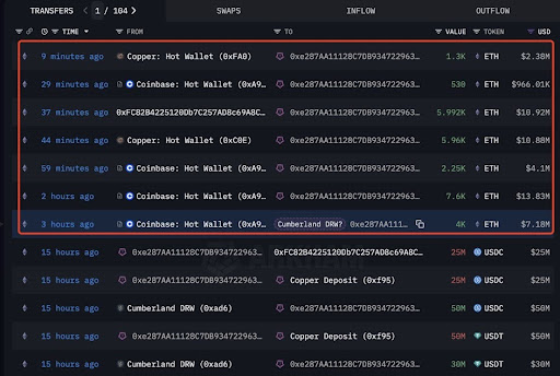 Аналитическая платформа в цепь Lustonchain выявила заметное увеличение накопления Ethereum, в значительной степени обусловленное институциональными китами. В течение трех часов, как сообщается, адрес кошелька, связанный с торговой фирмой Cumberland DRW, снял ошеломляющие 27 632 ETH на сумму около 50,24 млн. Долл. США. Эта передача была сделана из крупных обменов, включая Coinbase, Copper и Binance.
