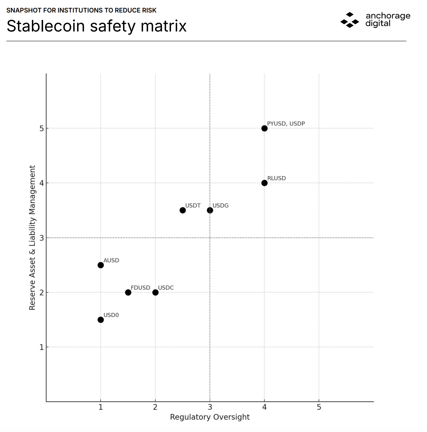Анкоридж был одной из первых криптовалютных компаний, которая провела банковский хартию США. Во вторник компания заявила, что запустила «Матрицу безопасности» в стабилизации в попытке оценить токены на основе регулирующих руководящих принципов для своих эмитентов. В рамках движения компания заявила, что планирует отойти USDC, AUSD и USD0.