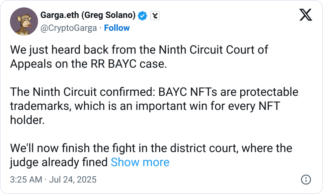 Солано похвалил победу на X, заявив, что скучные обезьяны – это «защищаемые товарные знаки, что является важной победой для каждого держателя NFT».