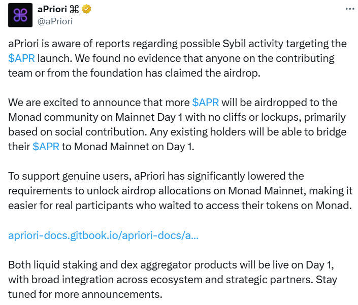 APriori снизила квалификационные требования для раздачи своей Monad Mainnet, стремясь вознаградить «настоящих пользователей», но заявила в пятницу, что не обнаружила «никаких доказательств того, что кто-либо из команды, участвовавшей в проекте, или из фонда заявил о раздаче».