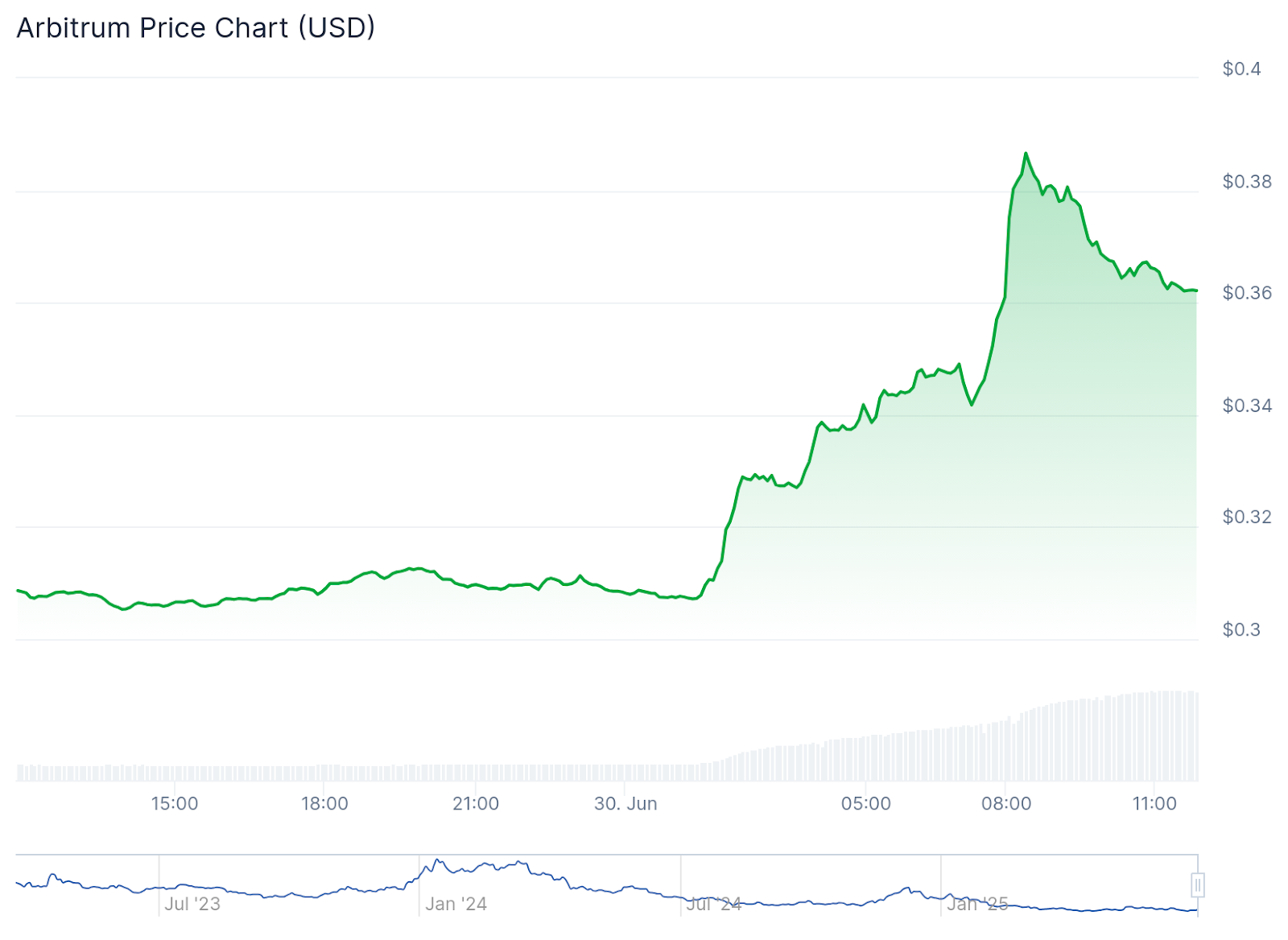 По данным Coingecko, токен арбитра (ARB) набрал 17,1% за последние 24 часа, чтобы торговать всего более чем на 36 центов и является крупнейшим выигрышем рынка криптовалюты в последний день.