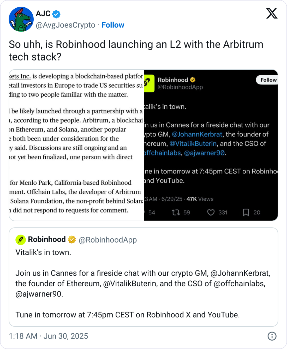 «Чистые спекуляции, но IMO [на мой взгляд] Ethereum + Arbitrum + RH означает только одно. Robinhood собирается объявить о своей цепочке завтра», – сказал Омар Канджи, партнер в венчурной фирме Dragonfly.