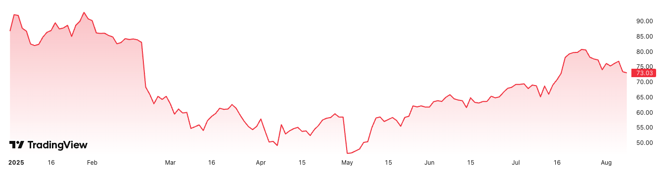Несмотря на сильные финансовые результаты Блока, его цена снизилась почти на 7% после выпуска отчета 2 квартала. Несмотря на то, что с мая видя заметный отскок, акции Block снизились на 21% по сравнению с уровнями цен, наблюдаемых в январе, сообщает Tradingview.