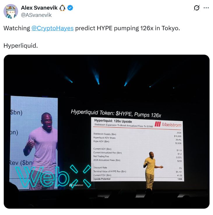 DEX также наблюдал значительный рост объема торгов в прошлом месяце, который в начале августа в начале 560 миллионов долларов США до 3,4 млрд. Долл. США 24 августа, согласно данным Defillama. Во время конференции Webx 2025 в Токио Хейс прогнозировал цену Hype, чтобы вырваться в 126x в течение следующих трех лет.