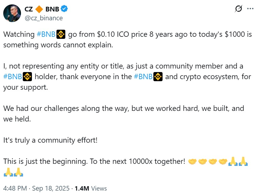 Когда в четверг BNB впервые набрал 1000 долларов, Чжао подчеркнул этот момент в праздничном посте на X.