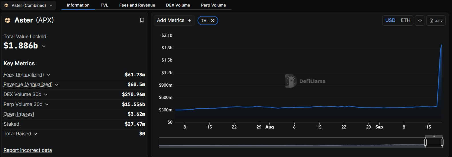 По данным Defillama, на основе децентрализованной цепной цепочки Aster на основе цепной сети ASTER кратко перешел 2 миллиарда долларов США общей стоимости (TVL) после запуска своего родного токена, прежде чем резко опуститься.