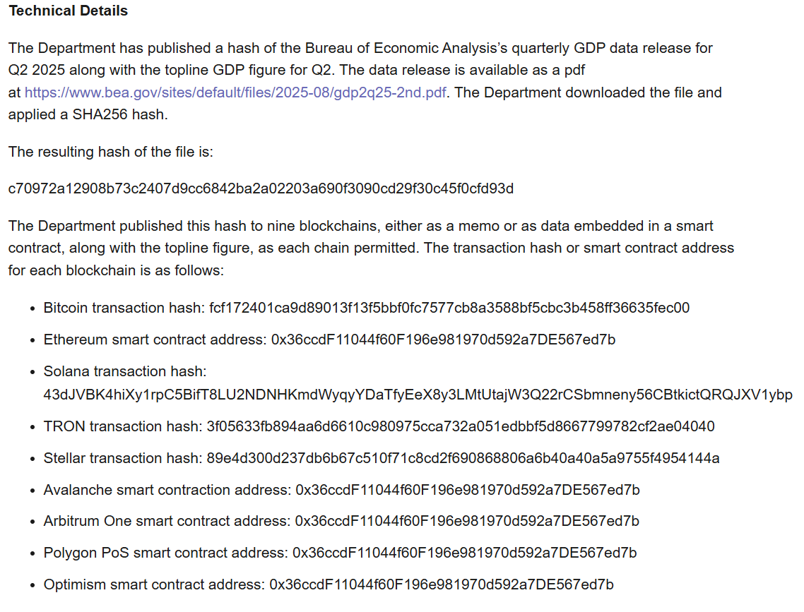 Начиная с данных с июля 2025 года, отчеты о ВВП будут опубликованы в девяти публичных сетях блокчейна, включая биткоин, эфириум, лавина, Солана, Трон, Стелла, Арбит -Один, Полигон Пос и Оптимизм, написали департамент в объявлении в четверг, добавив: «Добавив::