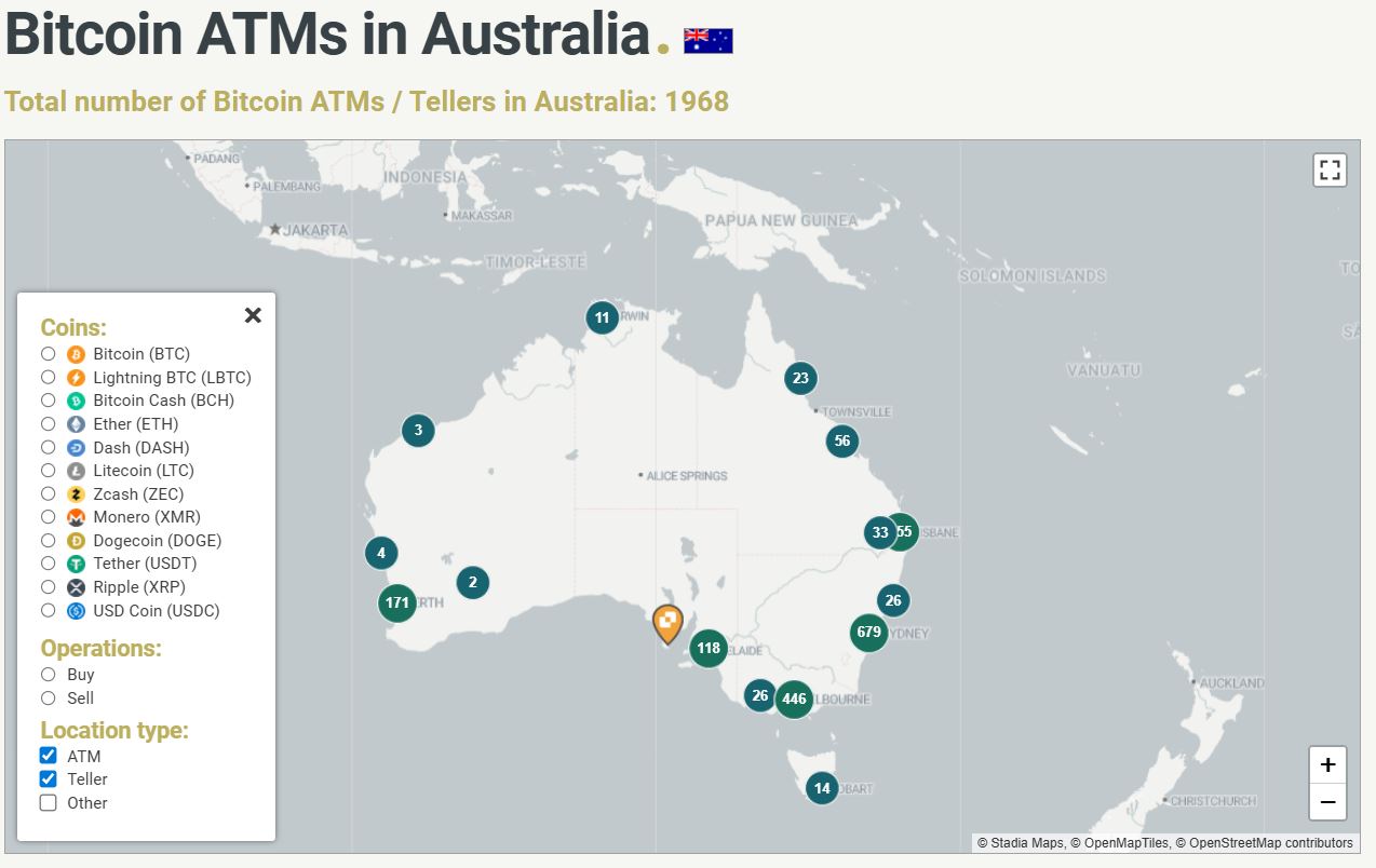 Австралия имеет третье место в мире банкоматов криптовалюты, с 1968 и растущим по последним подсчетам.