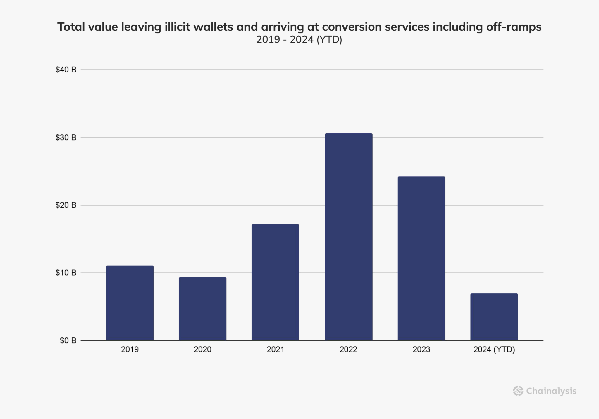 По данным специалиста по крип-анализу блокчейна, криптовалюта на сумму более 100 миллиардов долларов протекала из незаконных кошельков в услуги по конверсии в период с 2019 по середину 2024 года.