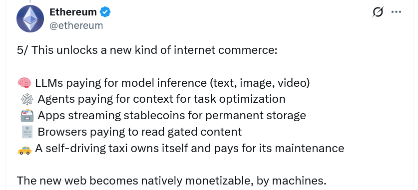 Пара сказала, что автономные агенты могут стать «самым большим пользователем электроэнергии Ethereum» в посте. Coinbase уже внедрила HTTP 402 с помощью «протокола платежей x402», согласно ее учетной записи Github.