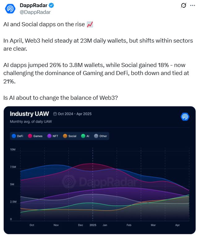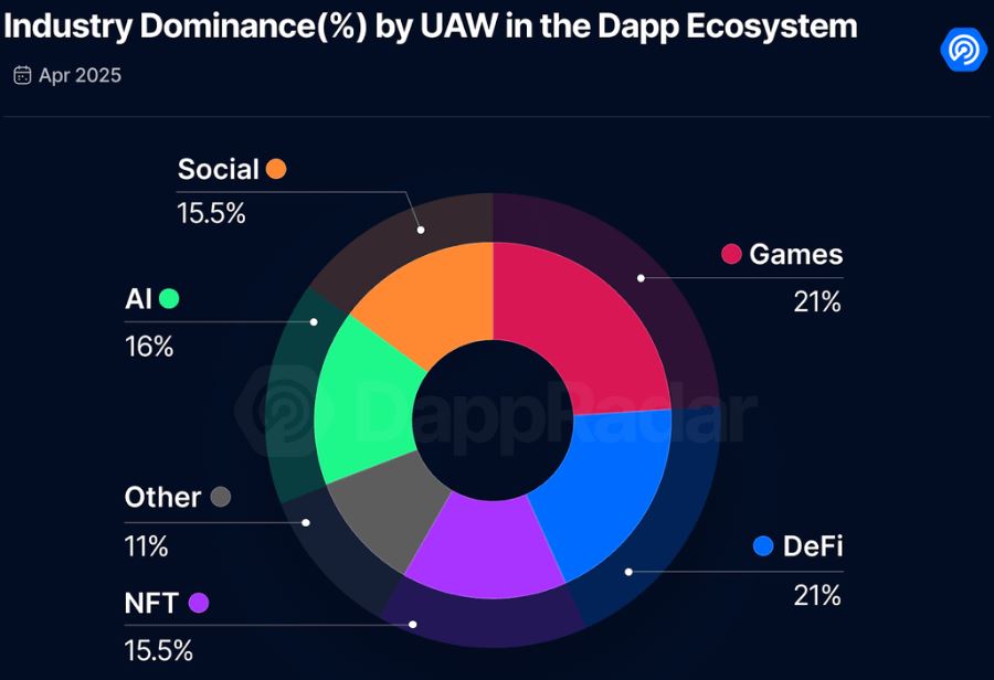 Gaming и Defi оба находятся на доминировании 21% в апреле, оцениваемые по проценту уникальных активных кошельков, в то время как ИИ поднялся до 16%, по сравнению с 11%, зарегистрированными в февральском отчете, показаны данные в апрельском отчете Dappradar.