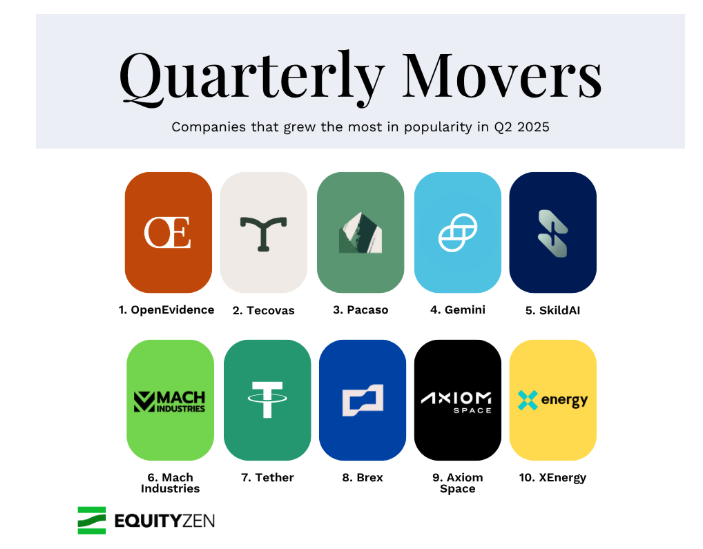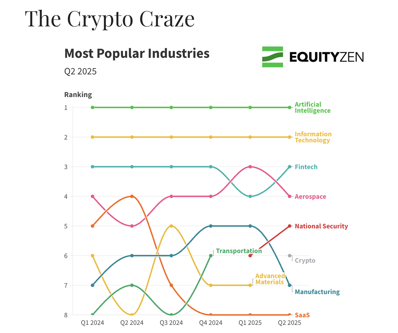 Equityzen сообщил, что сектор криптовалют был шестой по популярности индустрии частных инвестиций на своей платформе во втором квартале 2025 года.