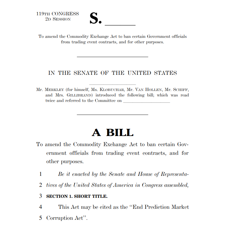 В тот же день сенатор Джефф Меркли представил Закон о прекращении коррупции на рынке прогнозирования, стремясь запретить государственным чиновникам торговлю контрактами на мероприятия с «существенной закрытой информацией», включая президента, вице-президента и членов Конгресса.
