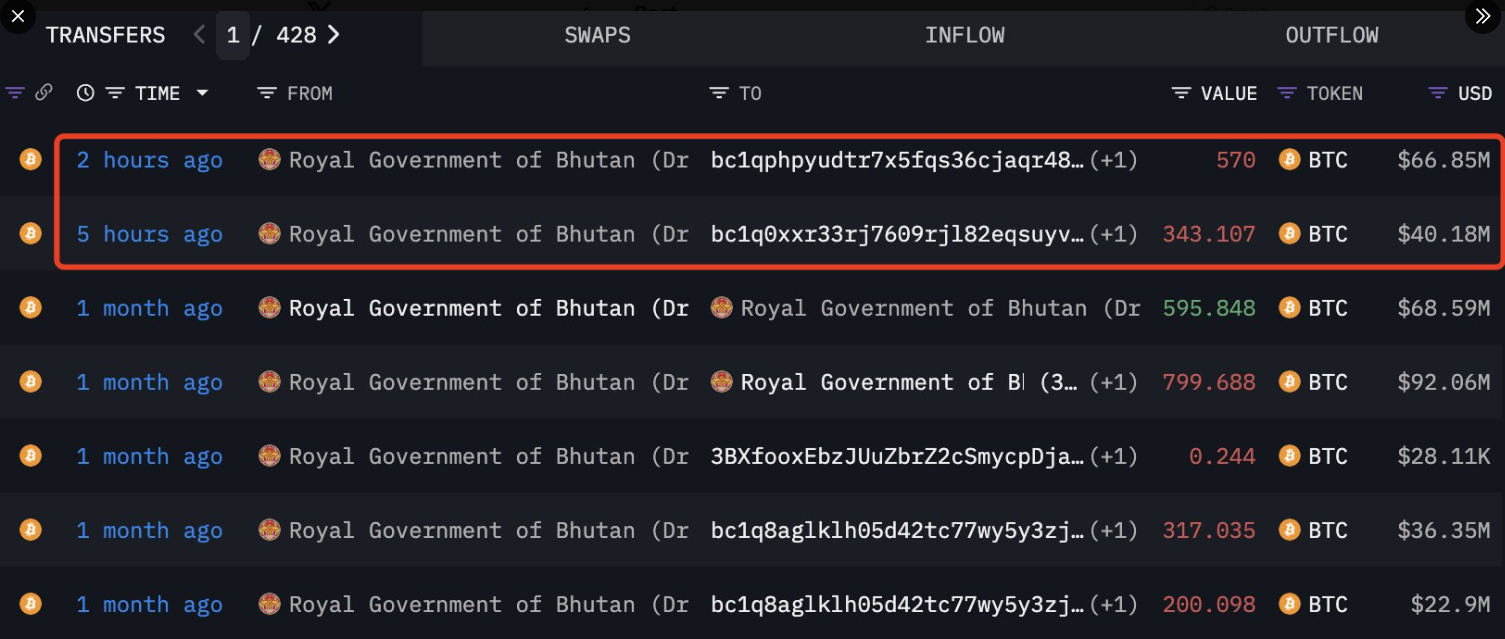 Бхутанские переводы поставляются, когда другие крупные держатели перемещают монеты перед потенциальной волатильностью.