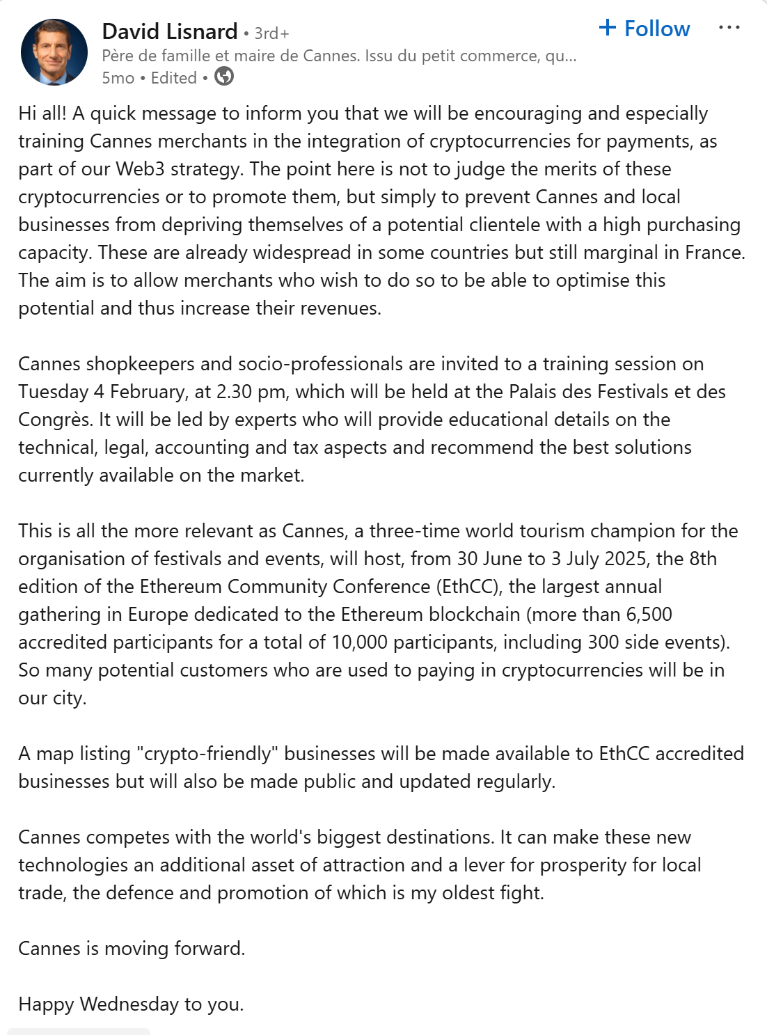 «Быстрое сообщение, которое сообщит вам о том, что мы будем поощрять и особенно обучать торговцев каннами в интеграцию криптовалют для платежей в рамках нашей стратегии Web3», – объявил Лиснард через сообщение (на французском языке) на LinkedIn.
