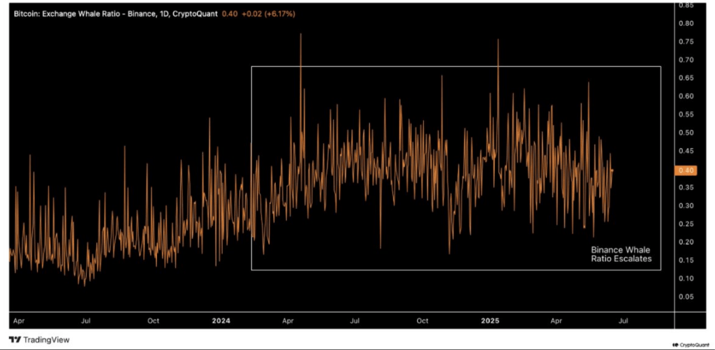 Резкий рост трансферных переводов крупных владельцев на бинанс привлек внимание наблюдателей за рынком. Согласно данным Cryptoquant, доля притоков Биткоин из так называемых китов выросла с минимума 0,08 летом 2023 года до 0,77 в 2024 году и 0,76 в 2025 году.