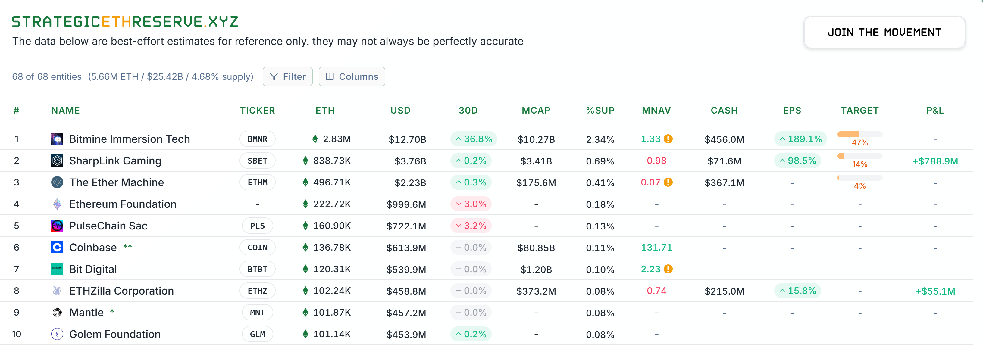 Согласно данным StrategicETHReserve.xyz, сделка, которая включала полное исполнение опционов андеррайтеров, позиционирует фирму как шестую по величине казначейство эфира (ETH) среди публичных компаний.